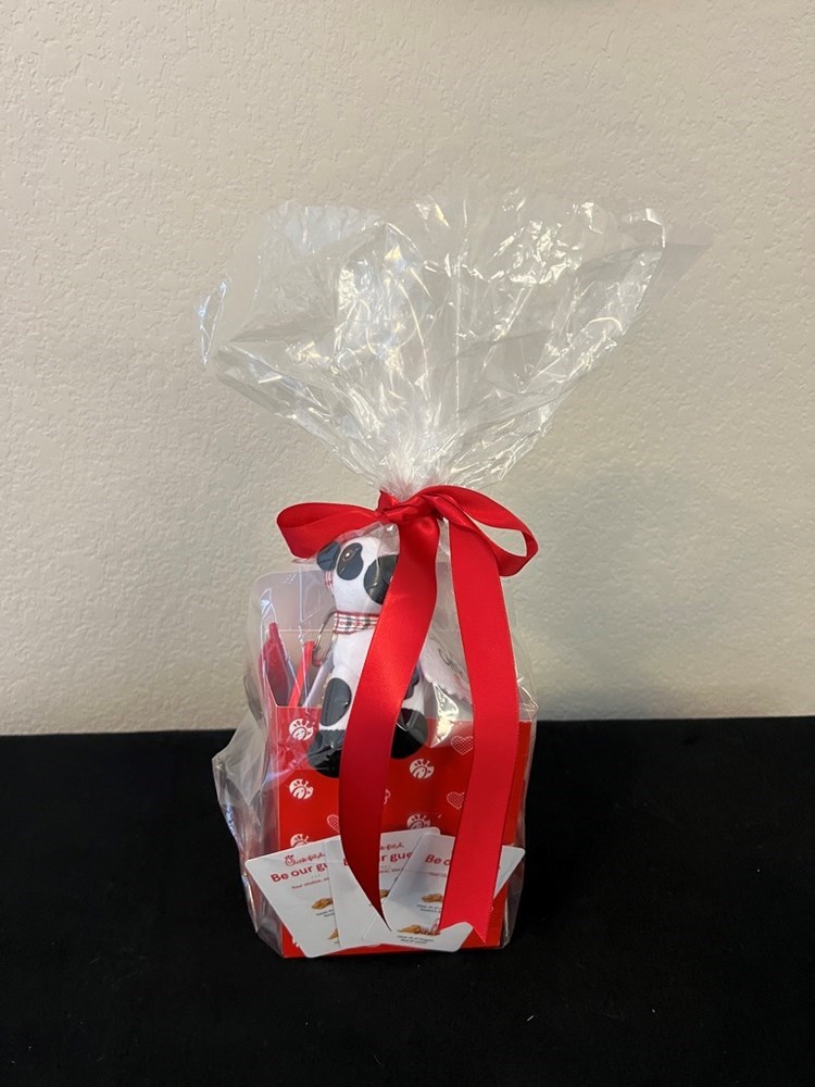 Chick-fil-A gift basket. Makes a great birthday or “just because” gift to make someone’s day. Includes Chick-fil-A swag including gift cards for 3 meals, small cow plush keychain, air freshener and pen.