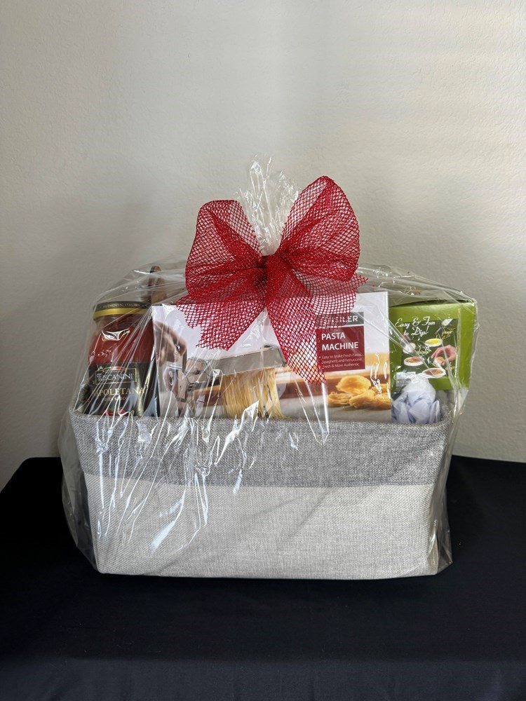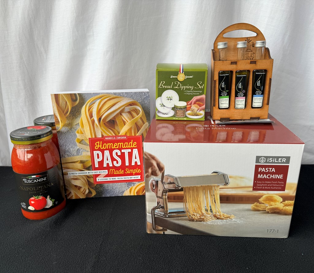 Everything you need for pasta at home. Pasta machine, pasta cookbook, (2) Napoletana pasta sauce jars, bread dipping set, and infused extra virgin olive oil bottles.