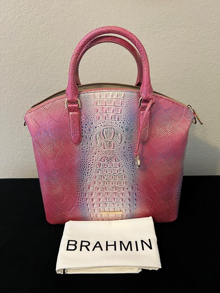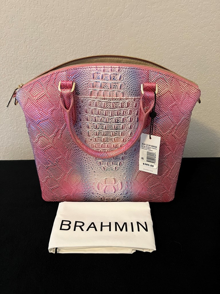 Easily carry all your essentials in luxurious style with Brahmin's Duxbury Sundial Multi Large Leather Satchel. Large zip top dome satchel Double handles Removable adjustable crossbody strap Back slide in pocket Footed bottom 4" handle drop 13" strap drop Dust bag included Approx. 14.2'' W x 12'' H x 5'' D