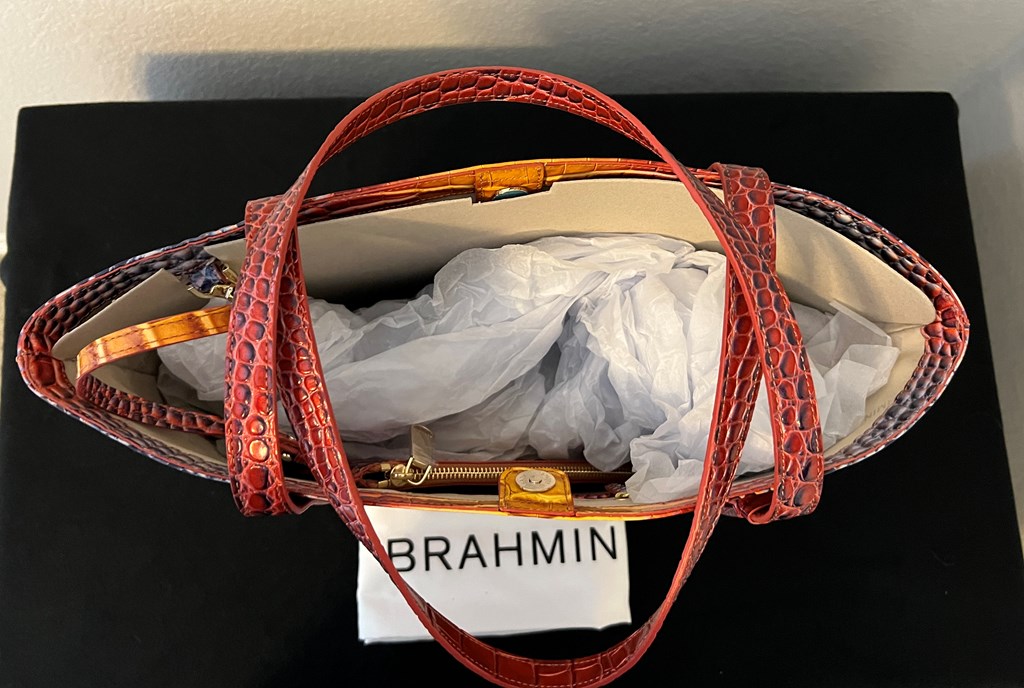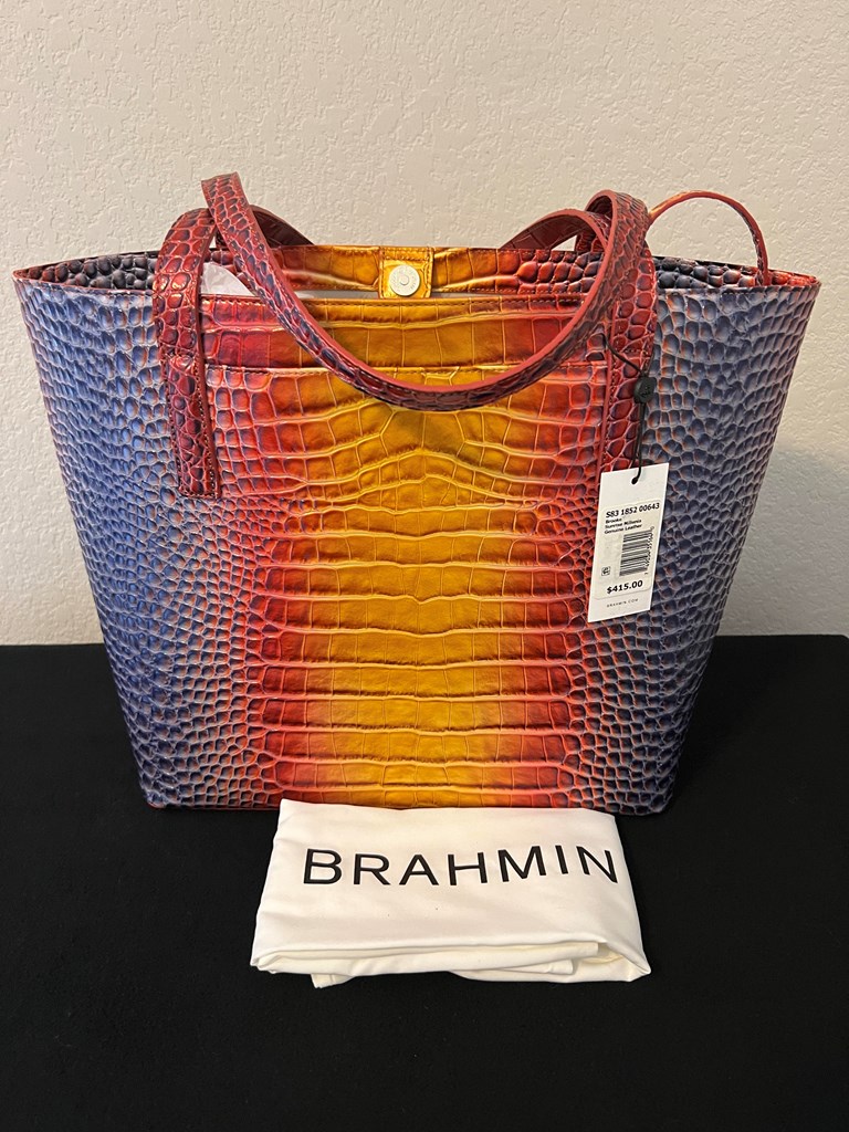 Beautiful Brahmin tote in Sunrise Millenia, a beautiful ombre that transitions from rich yellow and red hues to deep blue and purple shades on all-over flat croc-embossed leather. Magnetic closure Back slide in pocket Interior zipper pocket Dual organizer pockets Jewelry pocket Key clip Removable zipper pouch 10" handle drop Dust bag included Approx: 17″ W(top) 12.25″ H 5.5″ D