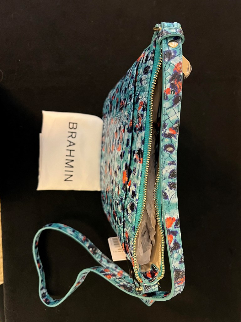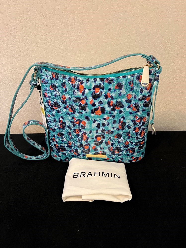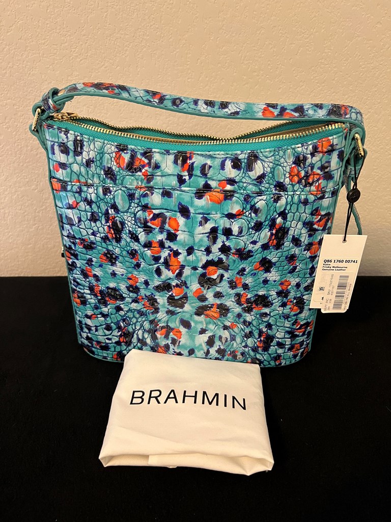 Must-have Brahmin Katie Frisky Melbourne genuine leather shoulder bag. Bold blue base and pops of bold orange. Zip top Back slide-in pocket Interior organizer pockets Pen pocket Dust bag included Approx: 10.5″ W 10.2″ H 2.5″ D