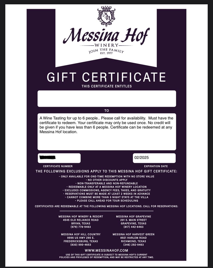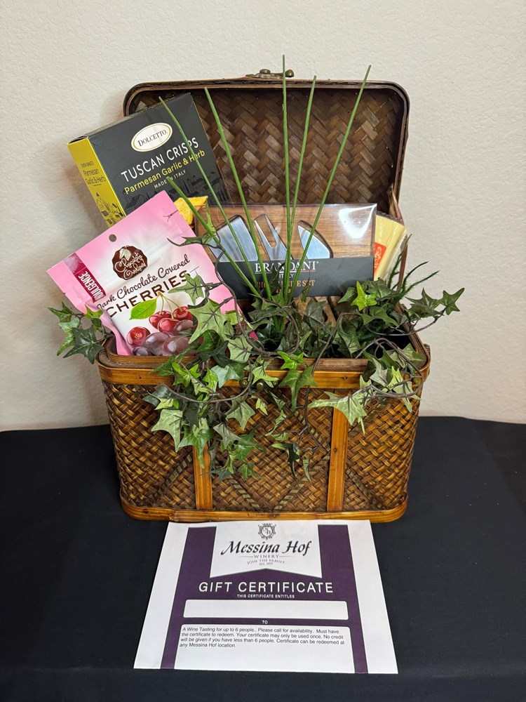Wine Tasting for 6 people redeemable at any Messina Hof location. Please read the certificate for details. Expires 02/2015. Includes a knife cheese set, crackers, gouda cheese and dark chocolate cherries in a lovely basket.