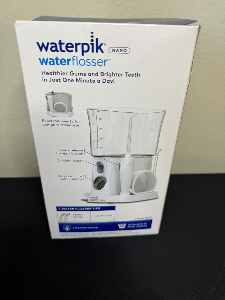 Waterpik Nano countertop water flosser delivers full-size water flosser performance in a compact and portable design. Perfect for small spaces.