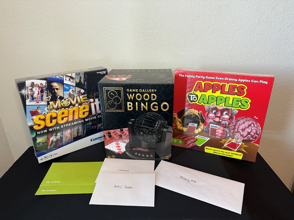 Lots of options for your next Family Night. Games, movies, dinner and treats. Includes Movie Scene It game; deluxe bingo set, Apples to Apples game; movie passes to AMC (4 movie passes + popcorn + drink) & Cinemark (4 movie passes); Midway BBQ- $50 gift card; The Gelatist 2- $10 gift certificates. Makes a great gift too!