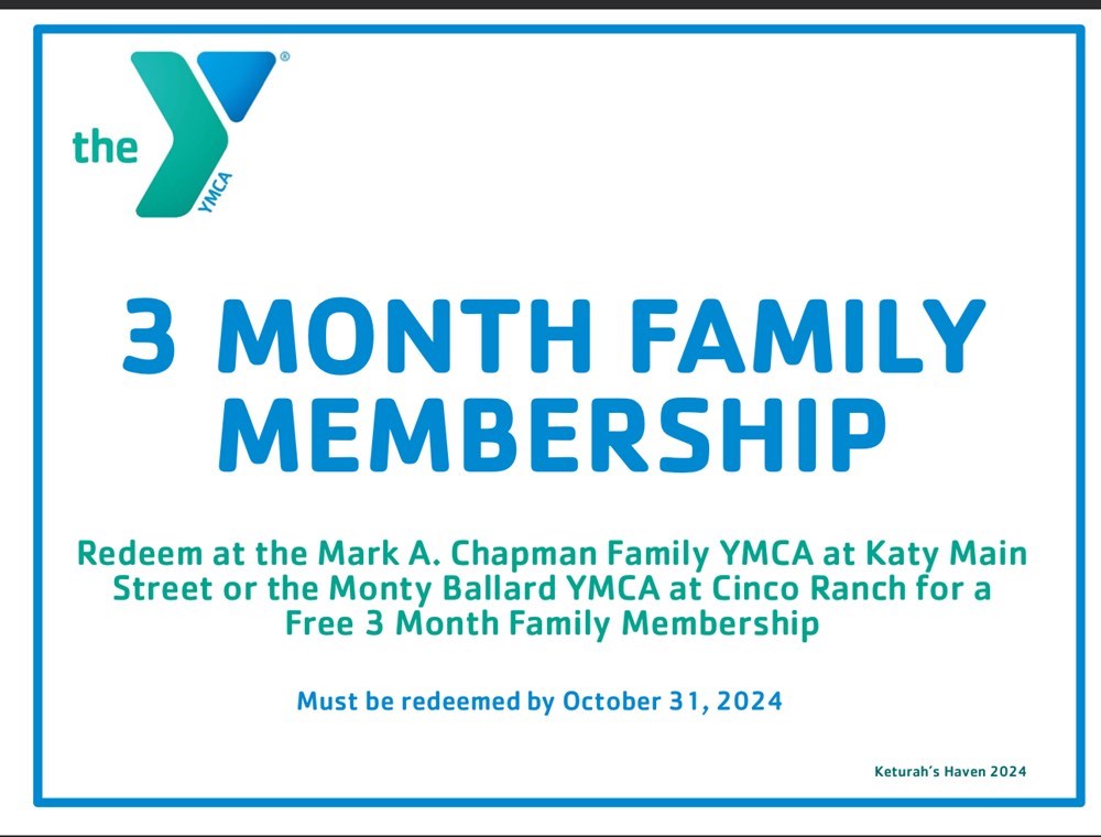 Never too late to get in shape! Three month family membership to Katy location YMCAs. Mark A. Chapman Family YMCA at Katy Main Street or the Monty Ballard YMCA at Cinco Ranch. Must be redeemed by October 31, 2024.