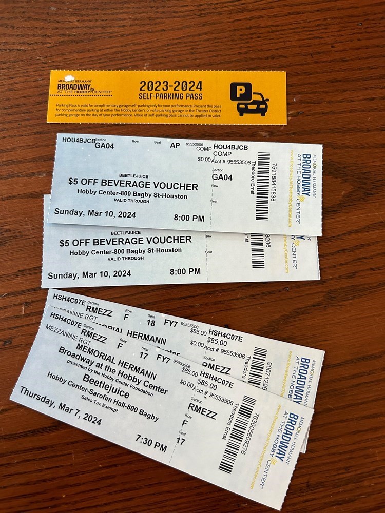 Just in time for your next date night! Two tickets to Broadway at the Hobby Center to see BEETLEJUICE. Includes two tickets in right mezzanine section, 2- $5 beverage vouchers and a self-parking pass.