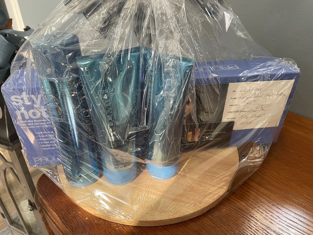 Treat yourself to a haircut and products to keep it beautiful. Includes Paul Mitchele Curling Iron, hair products, and Gift Card ($50) for haircut.