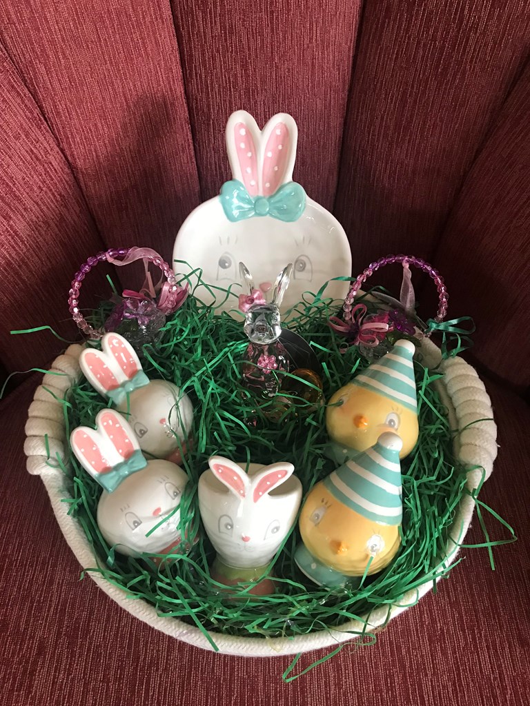 Easter will be here next month! Perfect to add or start to your home decor. Includes a bunny plate, two sets of salt and pepper shakers, one egg cup, two napkin holders and a glass bunny figurine. All items ready to gift in a white basket.