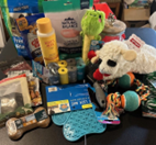 Your furry friend will love all these doggie goodies! Basket Includes: Lamb Chop Stuffy Dog Toy - Drool Magnet Dog Toy - Squeaky Bird Dog Toy - Rope/Ball Dog Toy - Chew Bone Beef/Cheese Treats Waste Bags - 10 Rolls Burts Bees Shampoo Dog Brush Bite Size Treats Chicken and Sweet Potato Treats Pet Lick Mat Treat Jar Dog Bone Treats Chew Buffalo Tuffie 2 Chicken Wrap Treats Ball Watermelon Bag Estimated Retail Value: $60