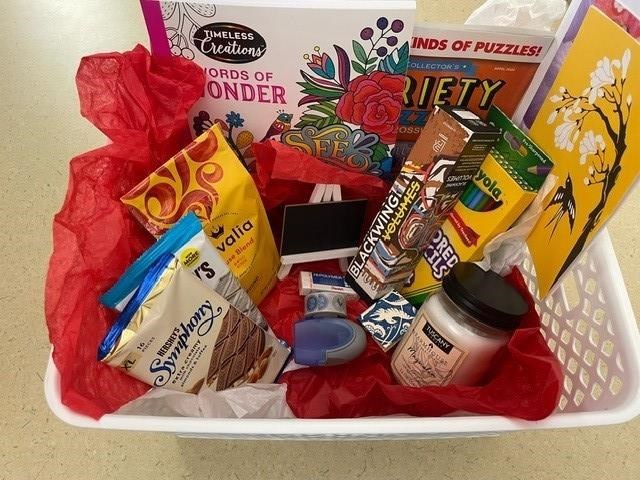 Sit back and relax and enjoy all the soothing items this basket has to offer! Basket Includes: Coffee Tea Coloring book Colored pencils Blackwing pencils Other art supplies Candle Fuzzy socks Lotion Soft blanket Puzzle book Bubble bath Sweet treat Card game **Some items are not pictured Estimated Retail Value: $100