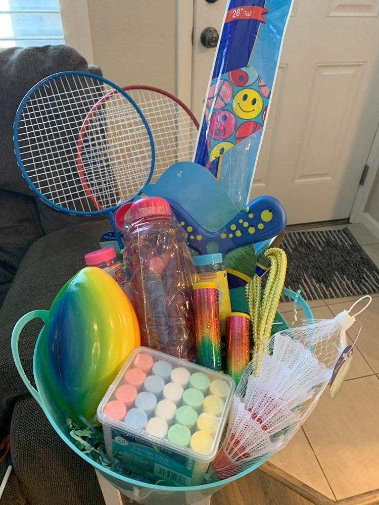 Enjoy some fun in the sun! Get outside and enjoy all the fun this basket has to offer! Basket Includes: Jump Rope Boomerang Football Bubbles Kite Badminton Set Sidewalk Chalk Sunscreen Sunglasses Water Bottle Estimated Retail Value: $20